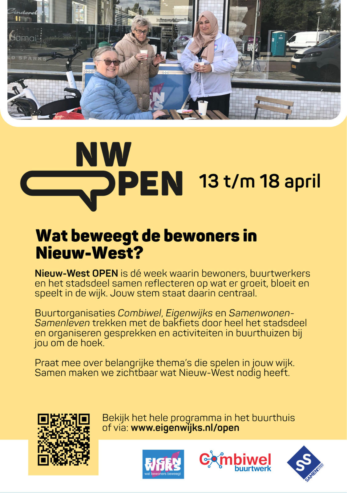 Nieuw-West OPEN is de week waarin bewoners, buurtwerkers en het stadsdeel samen reflecteren op wat er groeit, bloeit en speelt in de wijk. Jouw stem staat daarin centraal.
