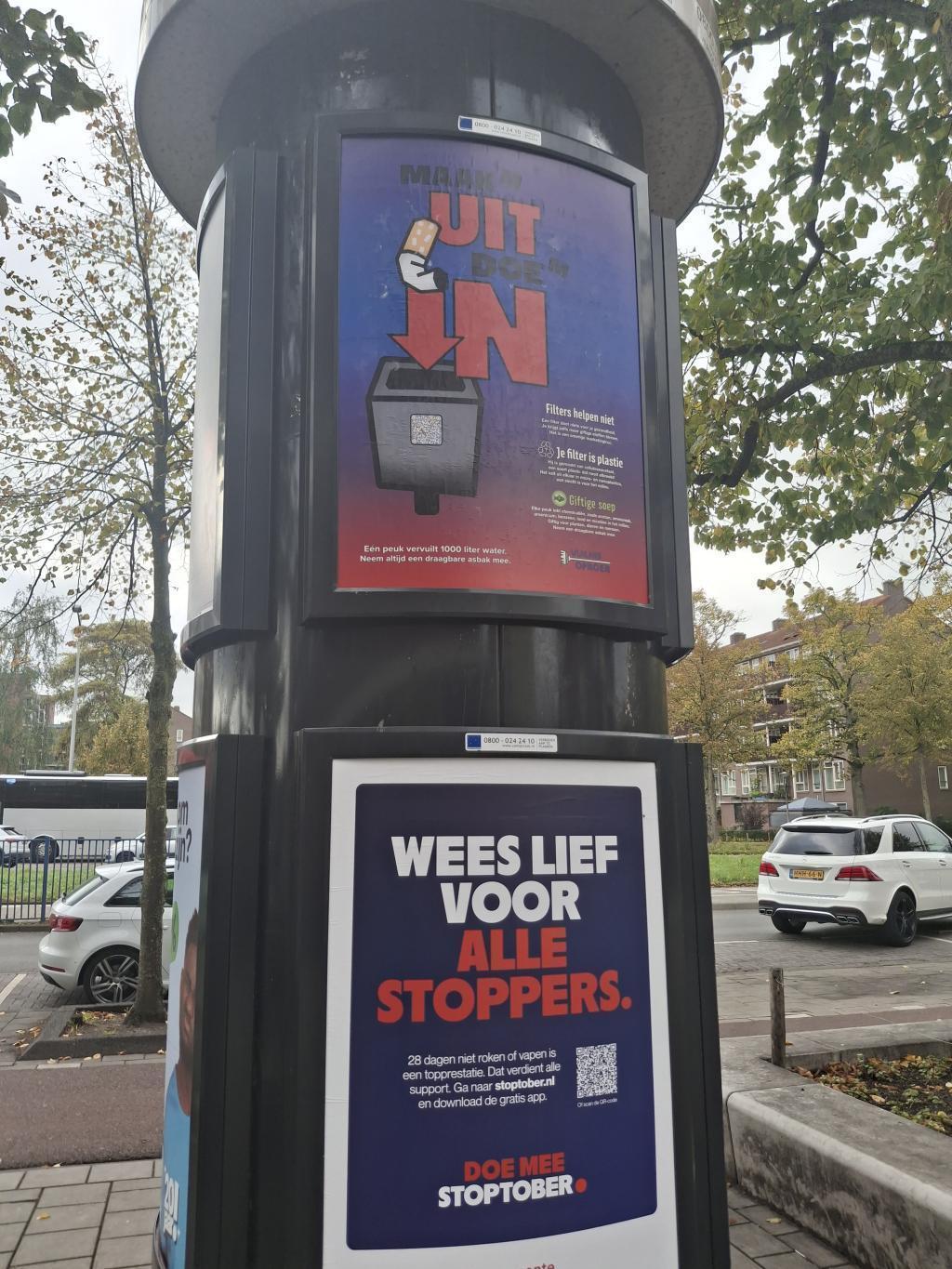 Deze en volgende week wordt de peukencampagne met grote posters in Nieuw-West begeleid.