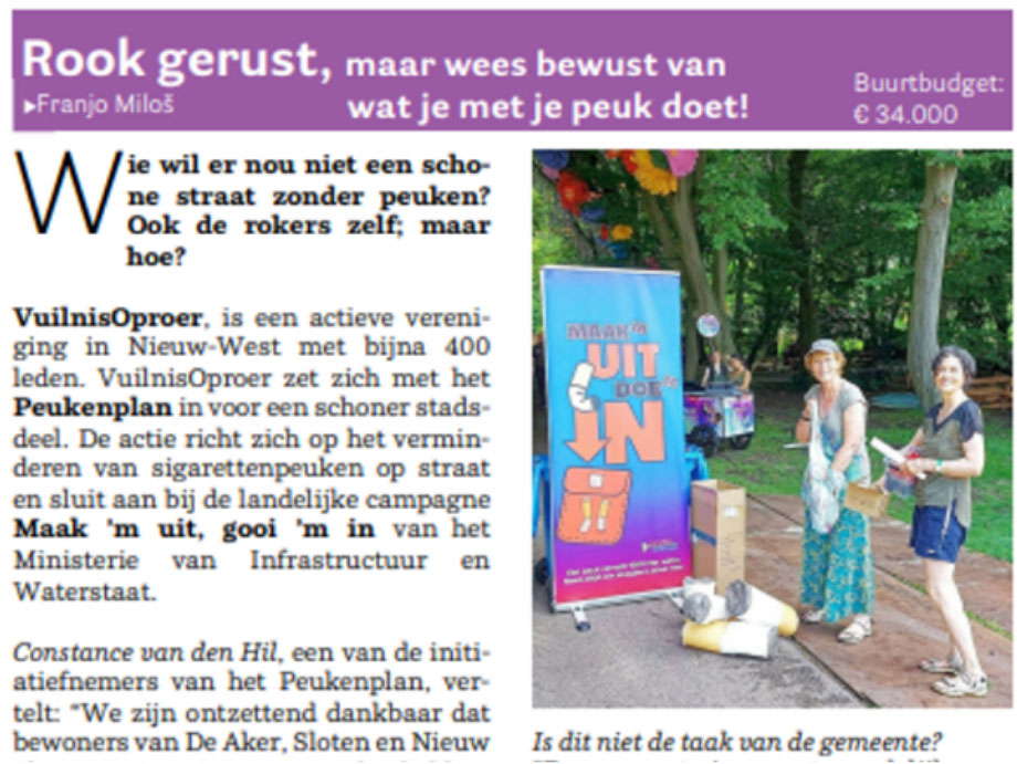 De bal ging rollen: de aanvraag voor PEUK-IN-BLIK doen we in alle vijf gebieden van Nieuw-West; er zijn kartrekkers nodig; we laten filmpjes maken. Kortom, veel enthousiasme. We kwamen er al gauw achter dat het een bewustzijnscampagne ging worden. Op een VO-vergadering in mei 2024 hebben we het plan gepresenteerd en verder uitgewerkt - VuilnisOproer heeft al peukenzuilen en leuke buisjes en envelopjes als pocketasbak. Eind 2024 is duidelijk dat alleen DASNS voor de campagne heeft gekozen. Naar dit gebied gaat het buurtbudget.