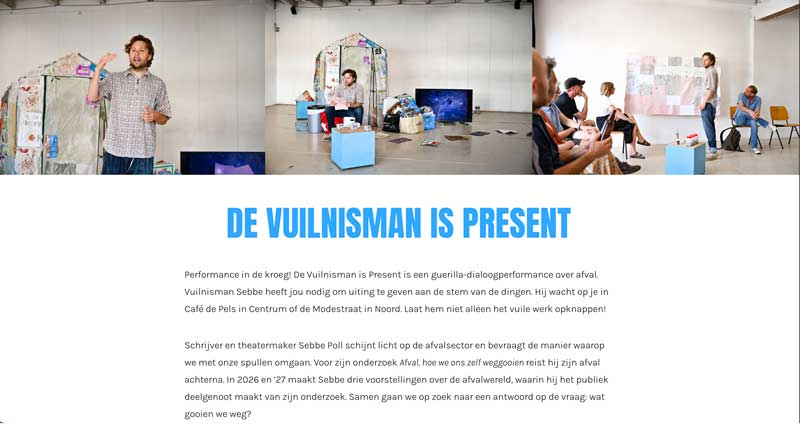 Performance in de kroeg! De Vuilnisman is Present is een guerilla-dialoogperformance over afval. Vuilnisman Sebbe heeft jou nodig om uiting te geven aan de stem van de dingen. Hij wacht op je in Café de Pels in het Centrum of de Modestraat in Noord. Laat hem niet alleen het vuile werk opknappen!