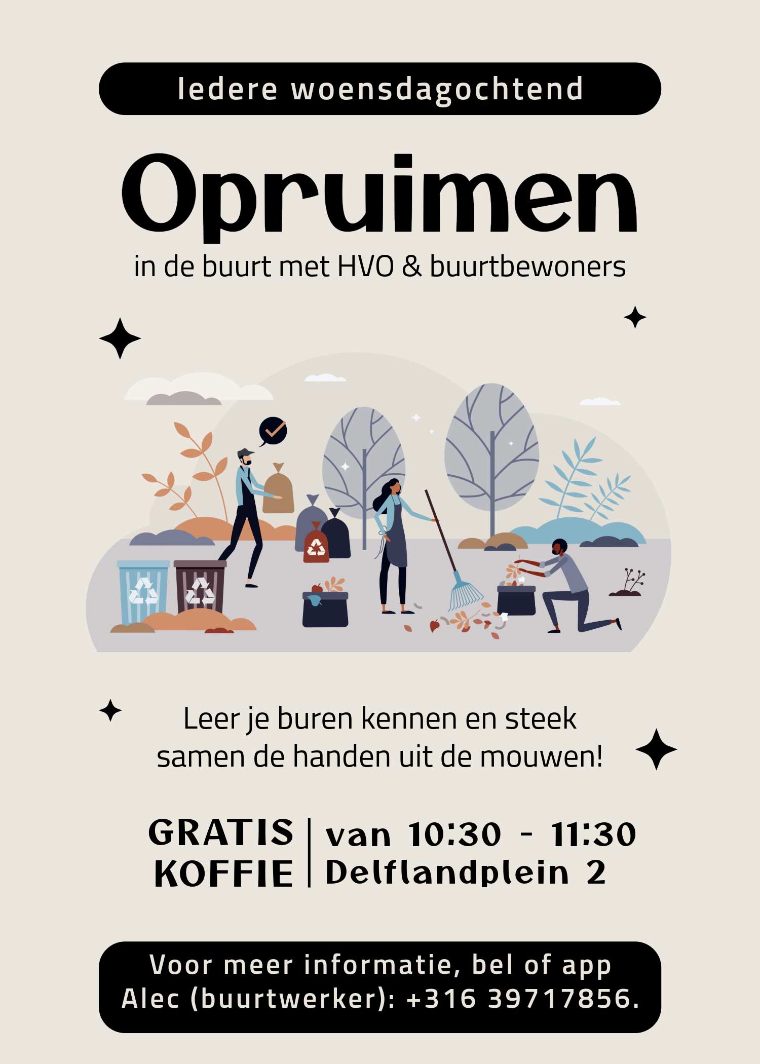 Om de week op woensdag maken we samen een wandeling door de buurt om de straten schoon te maken. Na afloop is er gezamenlijk buurtdiner.
