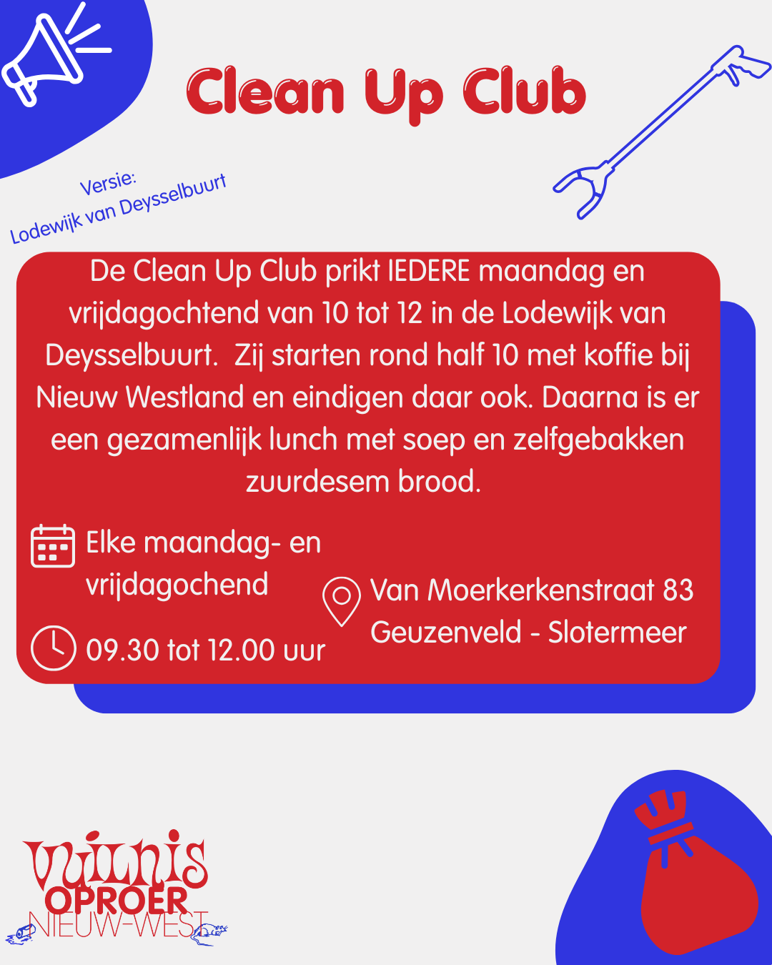Ze prikken elke maandagochtend en vrijdagochtend tussen 10 en 12. Ze verzamelen om half 10 met een kop koffie bij Nieuw-West Land (van Moerkerkenstraat 83) Ze prikken voornamelijk in de Van Moerkerkenstraat, de Lodewijk van Deyssel straat en alle wegen ertussen en eten daarna soep en brood met elkaar.