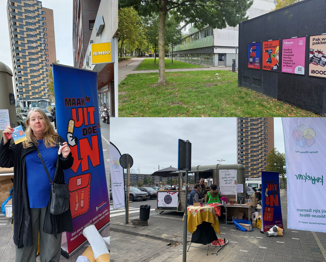 De bal ging rollen: de aanvraag voor PEUK-IN-BLIK doen we in alle vijf gebieden van Nieuw-West; er zijn kartrekkers nodig; we laten filmpjes maken. Kortom, veel enthousiasme. We kwamen er al gauw achter dat het een bewustzijnscampagne ging worden. Op een VO-vergadering in mei 2024 hebben we het plan gepresenteerd en verder uitgewerkt - VuilnisOproer heeft al peukenzuilen en leuke buisjes en envelopjes als pocketasbak. Eind 2024 is duidelijk dat alleen DASNS voor de campagne heeft gekozen. Naar dit gebied gaat het buurtbudget.